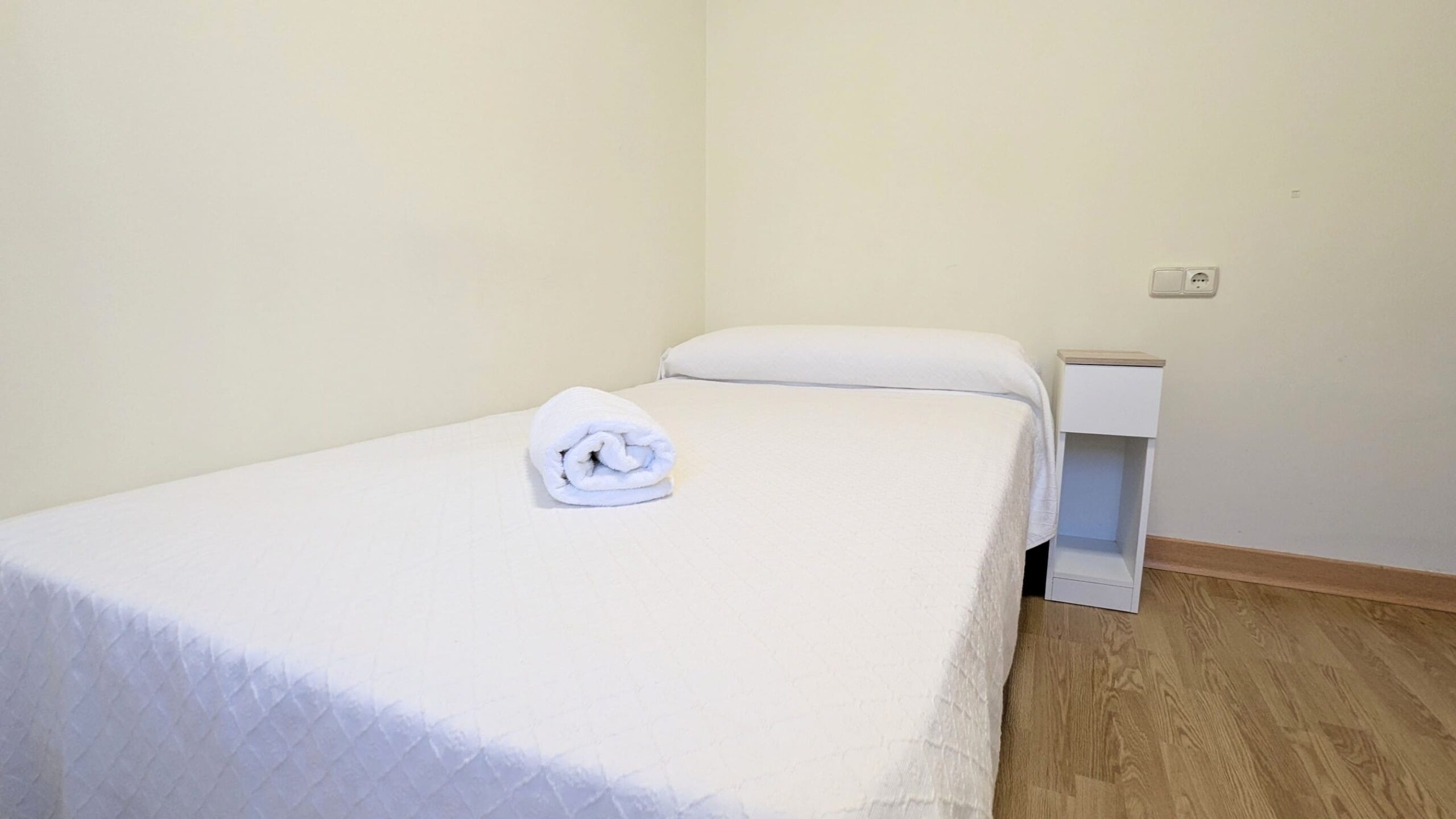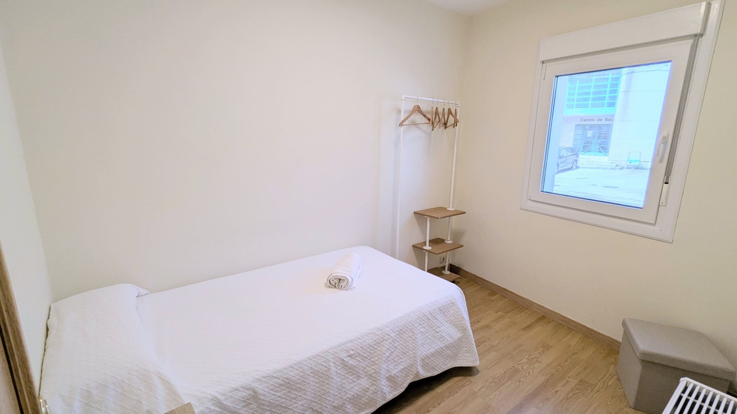 Es una habitación con una cama y un escritorio. Tiene un pequeño armario.